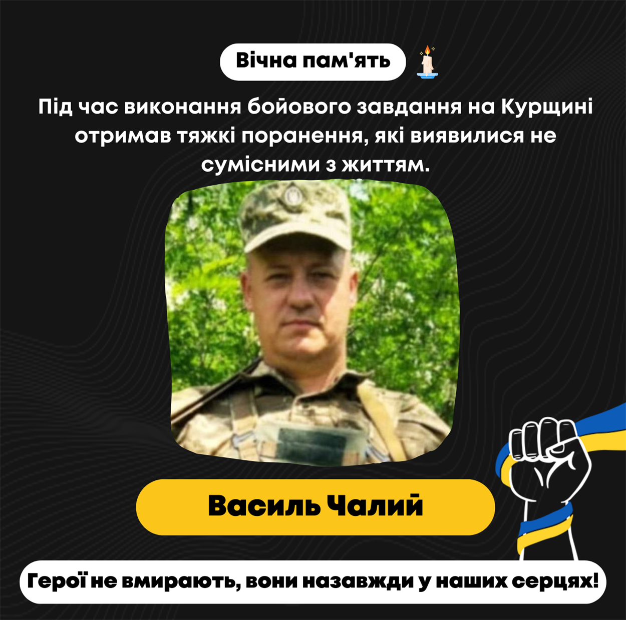 Вічна пам'ять і слава Василю Чалому! Герої не вмирають, вони назавжди залишаються в наших серцях!